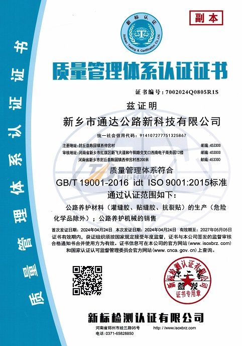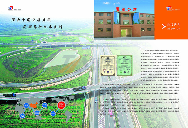 新鄉(xiāng)市通達(dá)公路新科技有限公司創(chuàng)建于2001年,地處河南新鄉(xiāng),是國(guó)內(nèi)從事道路養(yǎng)護(hù)作業(yè)解決方案的綜合型服務(wù)企業(yè)。公司主要服務(wù)涉及道路養(yǎng)護(hù)材料、機(jī)械及施工等領(lǐng)域,能夠?yàn)榭蛻?hù)提供高品質(zhì)的一站式服務(wù)。 通達(dá)公司具有健全的管理機(jī)制、前沿的技術(shù)水平、成熟的研發(fā)團(tuán)隊(duì),針對(duì)中國(guó)道路不同的地域環(huán)境因素,研發(fā)生產(chǎn)出多款道路養(yǎng)護(hù)材料和機(jī)械,解決客戶(hù)各種不同工況下的作業(yè)需求。公司已通過(guò)多項(xiàng)體系認(rèn)證和標(biāo)準(zhǔn)化認(rèn)證,擁有數(shù)十項(xiàng)軟著等知識(shí)產(chǎn)權(quán),并榮獲科技型中小企業(yè)、工程技術(shù)中心等諸多殊榮。 通達(dá)公司提供的道路養(yǎng)護(hù)材料、機(jī)械及施工等服務(wù),已遍布全國(guó)各省市地區(qū)的高速公路、國(guó)省道道路、市政道路、縣鄉(xiāng)道路等多家企事業(yè)單位,塑造了良好的市場(chǎng)信譽(yù)和品牌形象。 通錦繡鴻途,達(dá)盛世天下。通達(dá)公司將在道路養(yǎng)護(hù)作業(yè)領(lǐng)域逐步延展,始終秉承工匠精神,在實(shí)業(yè)的道路上砥礪奮進(jìn)。攜手廣大交通事業(yè)同仁,凝心聚力,共拓鴻途!